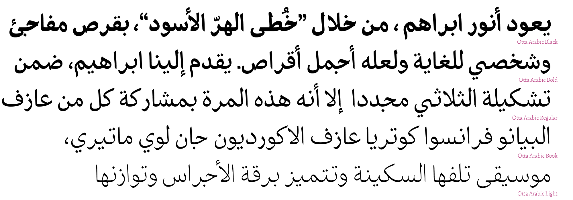 However, due to time constraints, they were left out in order to stop this snowball effect and finally bring closure to a stage. Instead of forcing Greek or Arabic into the Latin model as has been done before, Otta does the opposite. This is a feature we share with Alejandro Lo Celso in Atahualpa; unintentionally, the horizontal contrast has become a hallmark of PampaType for immersive reading fonts. Otta has more than 6,000 characters in a single file, and every time I open it in the Glyphs application, which helps me move faster in my productive work without knowing how to program, I am satisfied to see on the left side of the main window all the tickets for the scripts I have ventured into.
